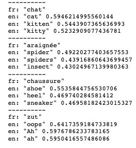 Voici les résultats obtenues (à chaque fois, 3 termes anglais les plus proches de la traduction et leur probabilité de correspondance avec le mot à traduire) :