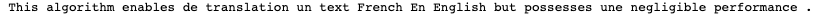 Compte tenu de la différence de structure linguistique entre le français et l’anglais (par exemple l’ordre nom-adjectif en français, adjectif-nom en anglais), la traduction mot à mot n’est pas optimale. De plus, nous pouvons remarquer que notre algorithme de traduction ne fonctionne pas pour les mots tels que : de, en, un, une, etc.