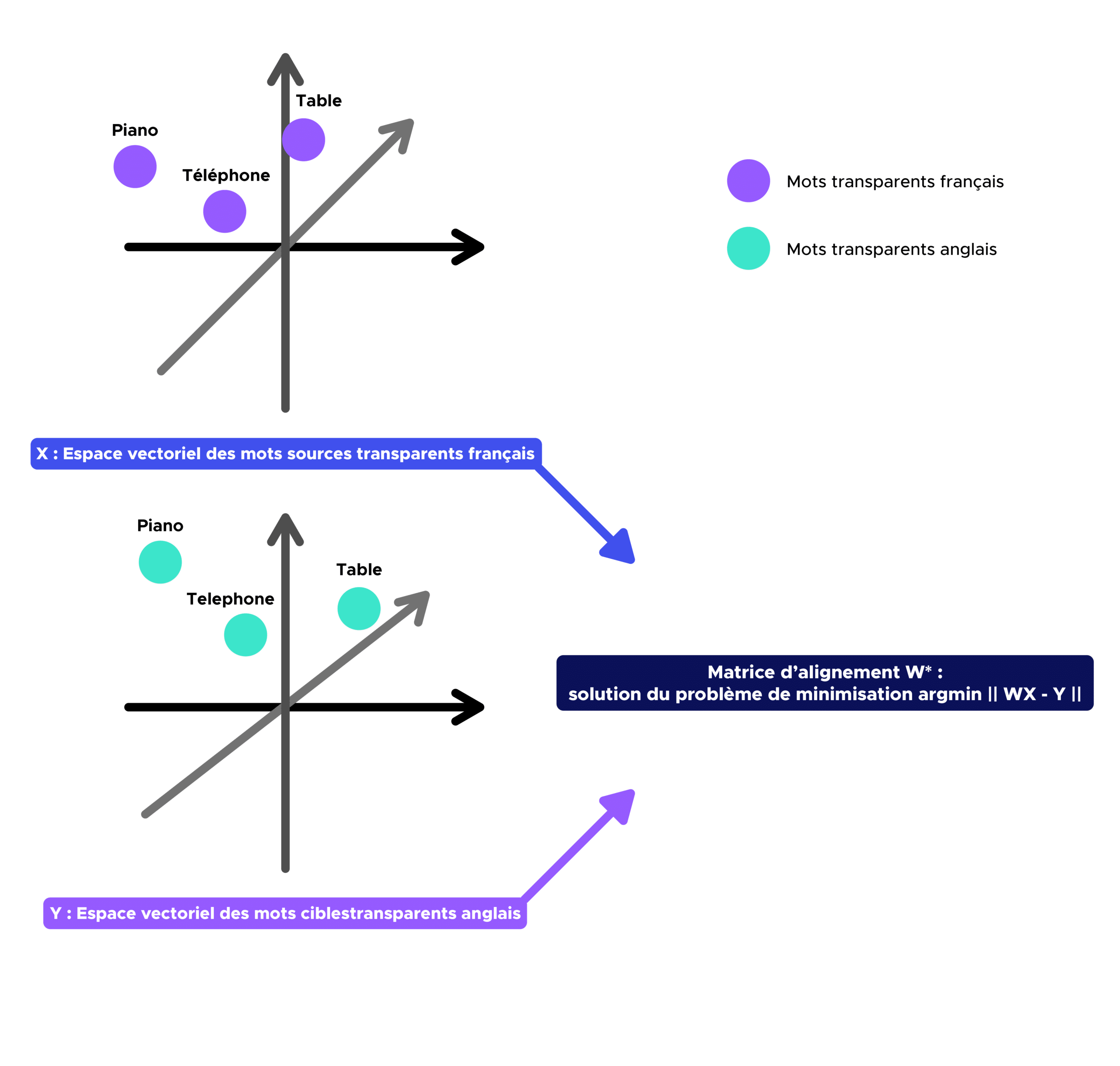 Les mots transparents vont être essentiels à la construction de l’algorithme de traduction au sens où ils correspondent à des points de repère permettant d’aligner les deux espaces vectoriels d’embeddings après application de la matrice de d’alignement W. Autrement dit, les mots transparents vont permettre de déterminer la transformation géométrique existante entre les deux sous-espaces vectoriels.