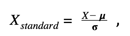 Pour ce qui est de la standardisation, la transformation est plus subtile que simplement ramener l’ensemble des valeurs entre 0 et 1, elle a pour but de ramener la moyenne μ à 0 et l’écart-type σ à 1.