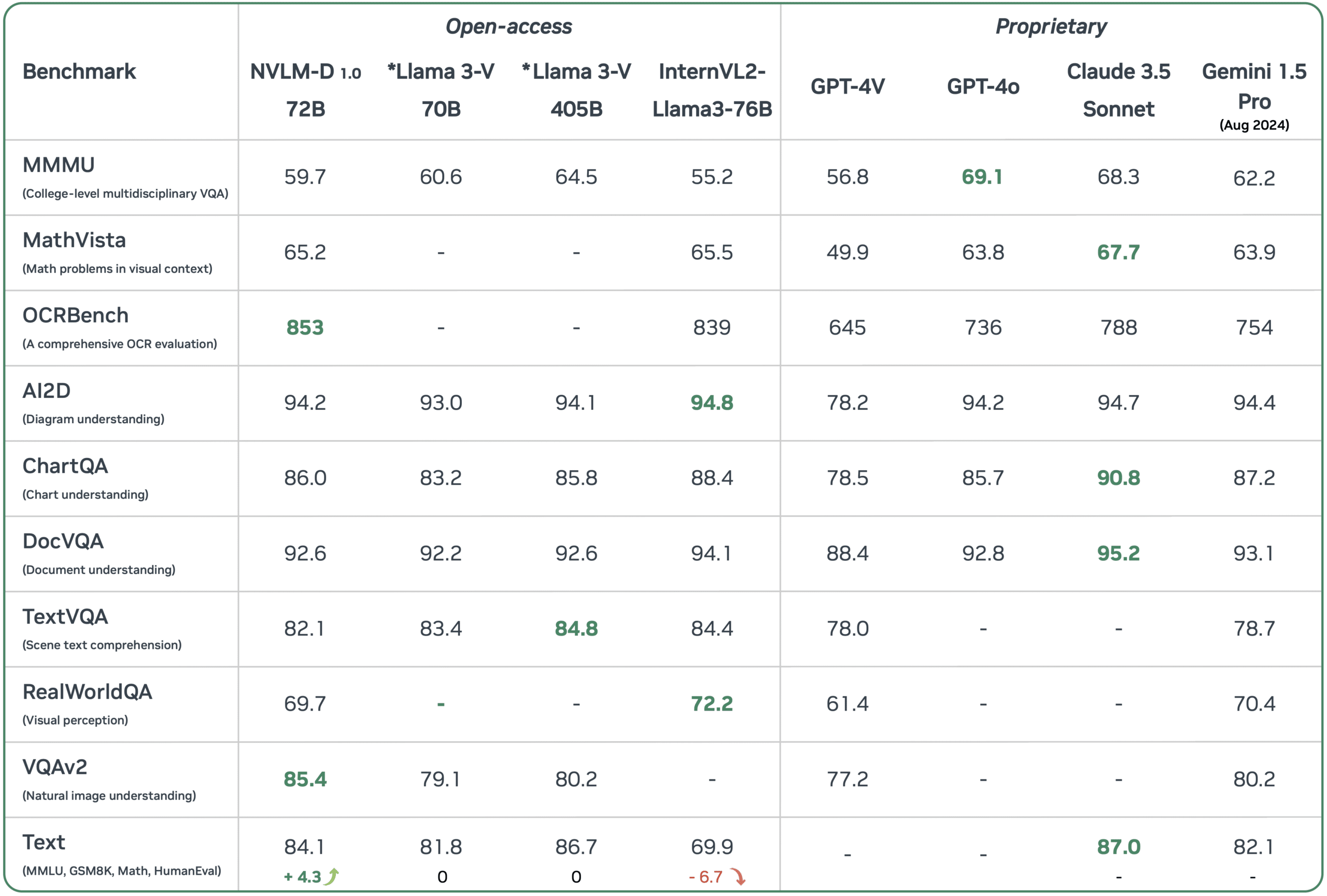 Ce qui distingue vraiment NVLM, c’est sa capacité à comprendre des images, des graphiques, et même des mèmes grâce à un traitement optimisé pour les tâches d’OCR (Reconnaissance Optique de Caractères) et de raisonnement visuel. Ainsi, il surpasse ou se place au même niveau que des modèles comme Claude 3.5 Sonnet ou Gemini 1.5 Pro sur des benchmarks clés. Cela montre que NVLM est un acteur majeur de la scène de l’IA, tout en étant plus accessible via son modèle open-source.