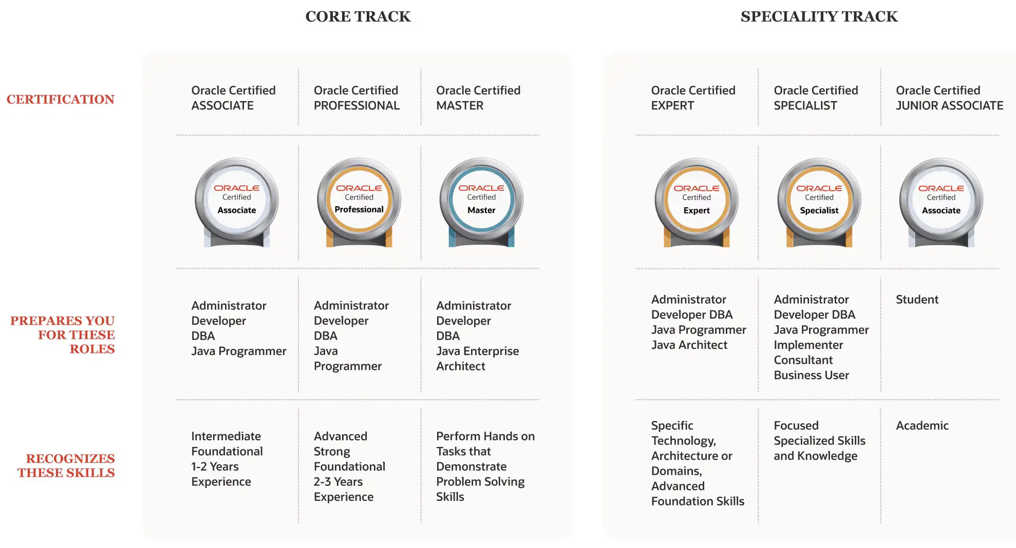 Afin de permettre aux candidats d’acquérir des compétences progressives et de les valider au fur et à mesure de leur parcours professionnel, Oracle a structuré ses certifications selon différents niveaux.Le premier niveau, Oracle Certified Associate (OCA) s’adresse aux débutants. Il permet d’acquérir une compréhension de base des produits et technologies Oracle.