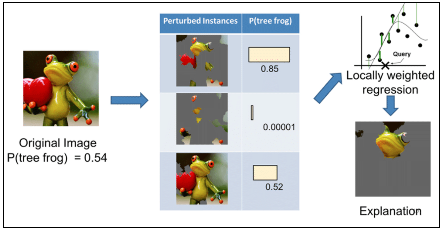 Dans cet exemple, LIME, en transformant un modèle complexe quelconque en un modèle linéaire interprétable, justifie la prédiction d’un algorithme de reconnaissance d’image en détectant précisément quelle portion de l’image fournie en entrée a permis de reconnaître la présence d’une grenouille.