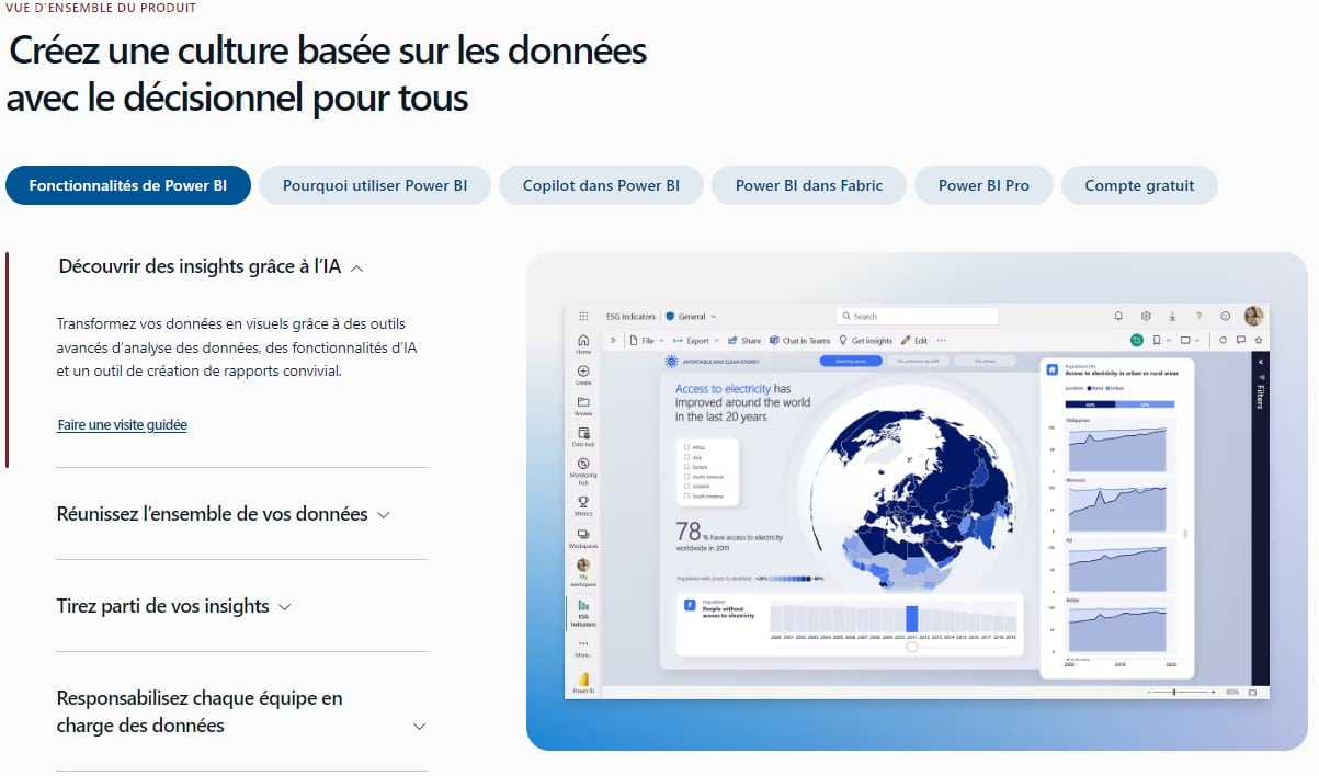 Microsoft Power BI est l’un des outils privilégiés des data analysts. Et pour cause, cette solution de business intelligence en self service vous permet de traiter vos données de manière plus efficace. Entre l’intégration des données, les créations visuelles et la vue mathématique, l’analyse de données est simplifiée. Mais surtout, Power BI a été conçue pour répondre exactement aux attentes de chaque entreprise. Vous pourrez ainsi adapter tous les processus en fonction de vos besoins et de vos ressources en interne.