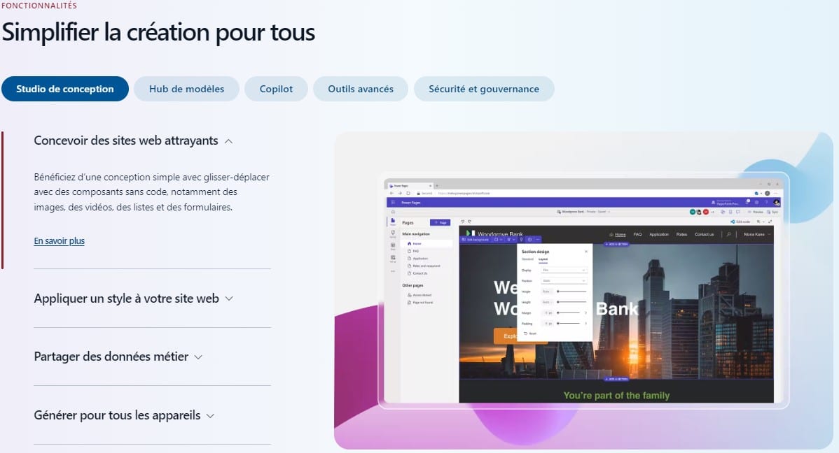 Après les applications, Power Platform vous permet aussi de créer des sites web. Là encore, vous pouvez utiliser la technique du glisser-déposer pour ajouter différents composants à votre website.