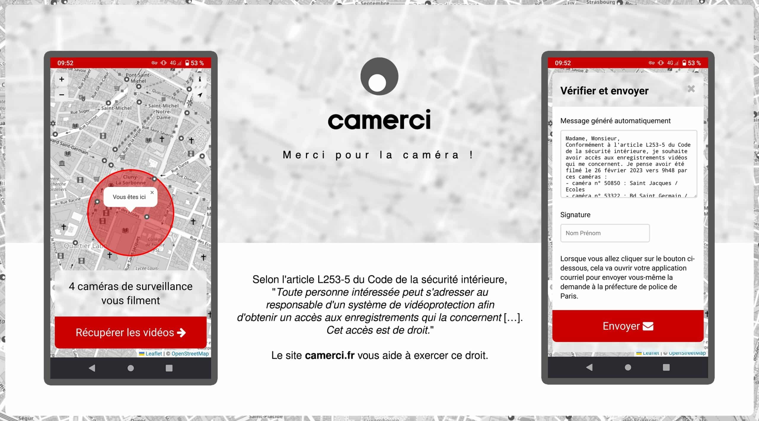 Ce site, Camerci, codé en un week-end selon son créateur, répertorie déjà plus de 1000 caméras dans sa base de données. Son utilisation est très simple, grâce à la géolocalisation ou en se baladant sur la carte interactive, on peut facilement observer les caméras de Paris, Montpellier ou dernièrement Agen. Il ne reste plus qu’à sélectionner la zone où l’on souhaite récupérer les enregistrements et faire sa demande par mail, directement sur le site.