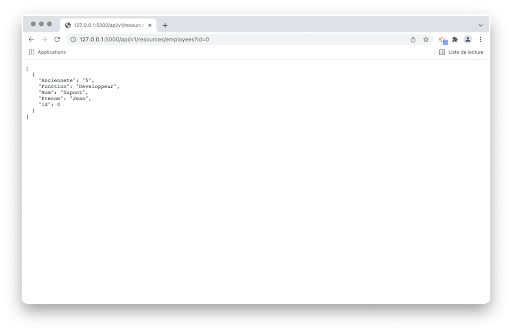 Ainsi, la fonction est exécutée dès lors qu’on accède à http://127.0.0.1:5000/api/v1/resources/employees.