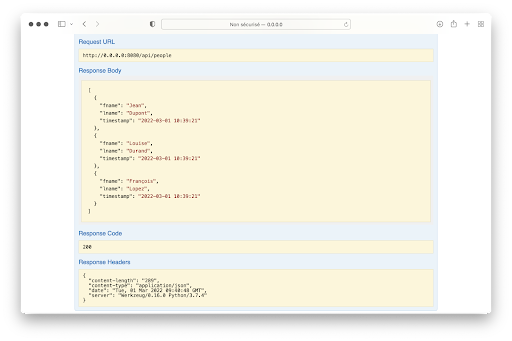 ce qui donne le résultat suivant en saisissant comme adresse http://0.0.0.0:8080/api/people dans la barre du navigateur :