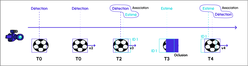 - T4 : Le filtre de kalman fait l’estimation de la position du ballon sur la base des mêmes paramètres de vitesse qu’à l’instant précédent (v3). Le détecteur réalise une détection. Ces deux rectangles sont suffisamment proches. On associe les deux et l’identifiant 1 est ré-affecté à l’objet détecté.