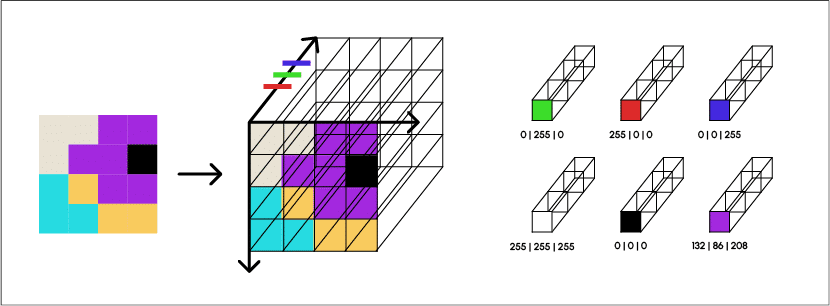 Chaque pixel est représenté par une série de trois valeurs (niveau de rouge, niveau de vert, niveau de bleu) qui se combinent pour former la couleur d’un pixel.