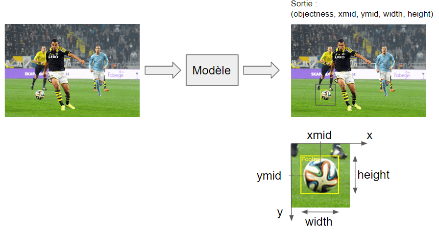 Ces objets sont les données d’entrée des modèles de Deep Learning que nous utiliserons par la suite. L’objectif est de prédire un rectangle d’encadrement pour les balles de football potentiellement présentes dans les images données au modèle. Ces rectangles sont définis par leurs centres, leurs hauteurs et leurs largeurs.