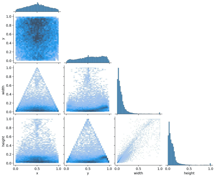 Répartition des variables cibles : xmid, ymid, width, height et relations entre elles.