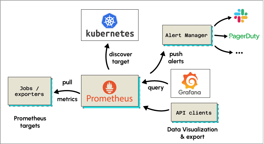 Prometheus est un outil de monitoring polyvalent essentiel pour surveiller la santé de vos systèmes et applications, et garantir une expérience utilisateur de qualité pour vos utilisateurs finaux. Essayons de comprendre l’architecture de Prometheus qui est basée sur un modèle de type « pull » (tirer) dans lequel le serveur Prometheus récupère les données de métriques auprès des cibles qu’il surveille.