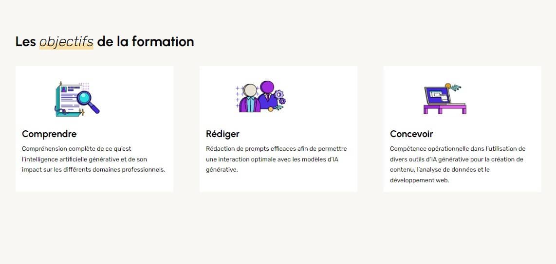 À la fin du parcours, vous serez en mesure d’utiliser l’IA générative pour créer n’importe quel type de contenu, pour le développement web ou encore pour l’analyse de données. Vous serez fin prêt à travailler en tant que Prompt Engineer !