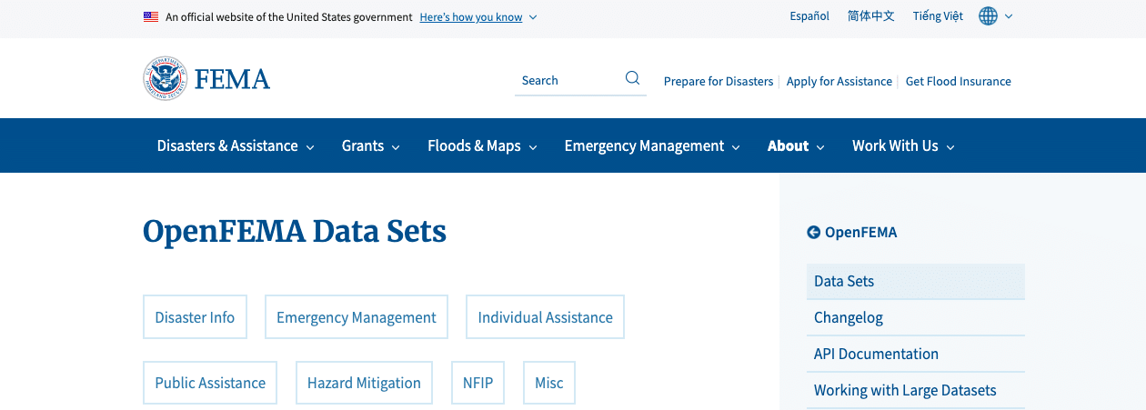 L’agence américaine FEMA (Federal Emergency Management Agency) est destinée à prévenir et protéger la population des menaces et des dangers qui présentent un risque sur le territoire américain. Cette organisation a mis en place un site pour permettre un libre accès à des bases de données collectant des informations sur différents sujets.