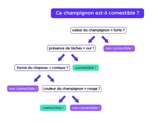 Comme son nom l’indique, un arbre de décision aide le Data Scientist à prendre une décision grâce à une série de questions (aussi appelées tests) dont la réponse (oui/non) mènera à la décision finale.