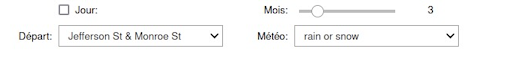 Le menu permet de sélectionner la station de départ des trajets, la météo du jour où les trajets ont été réalisés et le mois où ils ont eu lieu. Le découpage de l’histogramme en jours peut être coché ou non.