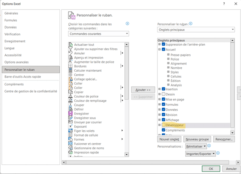 Mais avant cela, il est primordial de vérifier que l’onglet Développeur est activé et présent dans le Ruban d’Excel. Pour cela il suffit d’aller dans le menu Fichier / Options / Personnaliser le ruban puis cochez l’onglet Développeur.