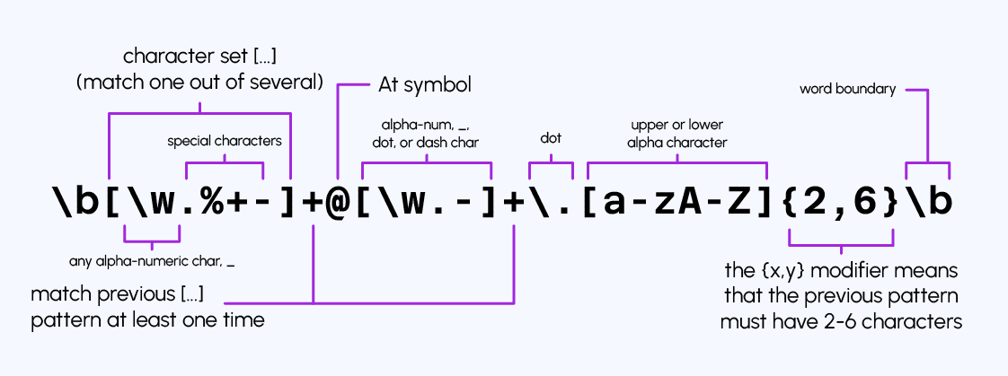 Une regex est composée de caractères et de symboles spéciaux permettant de définir un modèle (pattern). Ce modèle peut correspondre à une chaîne de caractères précise ou à un ensemble plus large. Voici les éléments fondamentaux :
