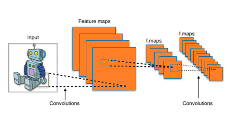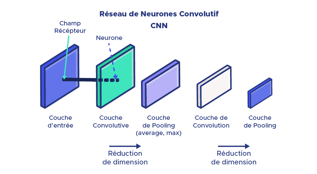 Les réseaux de convolution apportent une solution efficace à ce problème : chaque couche intermédiaire du réseau est exposée à une portion de l’image appelée champ récepteur pour lequel plusieurs neurones effectuant différentes actions, calculent une matrice de convolution correspondante.