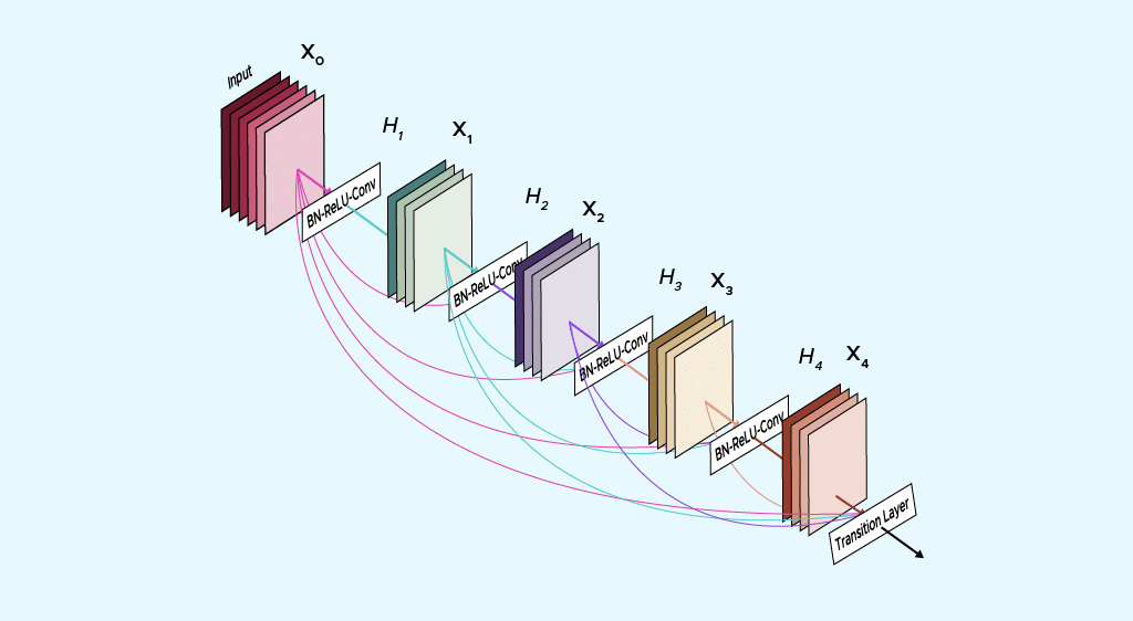 La grande spécificité de cette architecture réside dans l’entrée des couches qui rassemble par concaténation toutes les entrées des couches précédentes (voir schéma) : créant ainsi une feature map, tout en conservant une résolution spatiale identique : on parle de channel-wise concatenation.