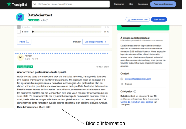 L’idée est de rassembler dans un seul fichier CSV tous les commentaires et les notes des apprenants disponibles sur trustpilot. On va se limiter aux avis donnés en Français par souci de simplicité.