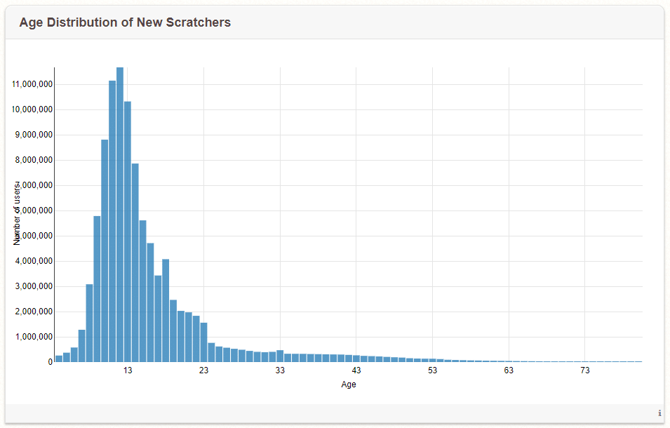 La moyenne d’âge des utilisateurs est de 12 ans même si l’on retrouve des comptes actifs âgés de plus de 70 ans. En dernier point, l’Amérique est le continent se servant le plus de Scratch avec pas moins de 38 millions d’utilisateurs provenant des Etats-Unis et 4 millions venant du Canada ou du Brésil. De son côté, la France possède presque 2 millions de comptes inscrits.