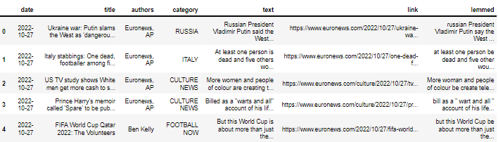 Tout d’abord, nous importons les librairies nécessaires pour la suite puis, nous constituons un dataframe grâce à la liste de dictionnaires list_of_articles.