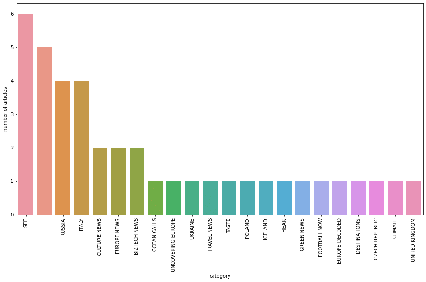 Dans un premier temps, nous nous intéressons aux différentes catégories d’articles en affichant le nombre d’articles par catégorie grâce à la librairie Seaborn.