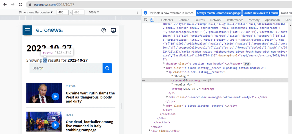 Nous remarquons également qu’il y a une pagination à 30 articles par page et que lorsque le nombre d’articles est supérieur à 30, il est possible de passer d’une page à l’autre en insérant un query param dans l’url : https://www.euronews.com/{years}/{month}/{days}?p={page}