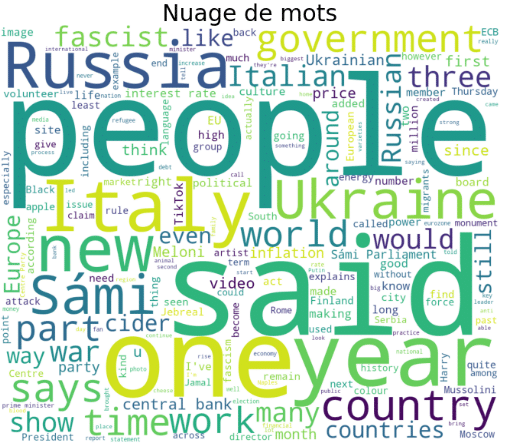Enfin, nous définissons une fonction permettant de construire un nuage de mots grâce au module wordcloud qui prend en argument notre série contenant les articles.