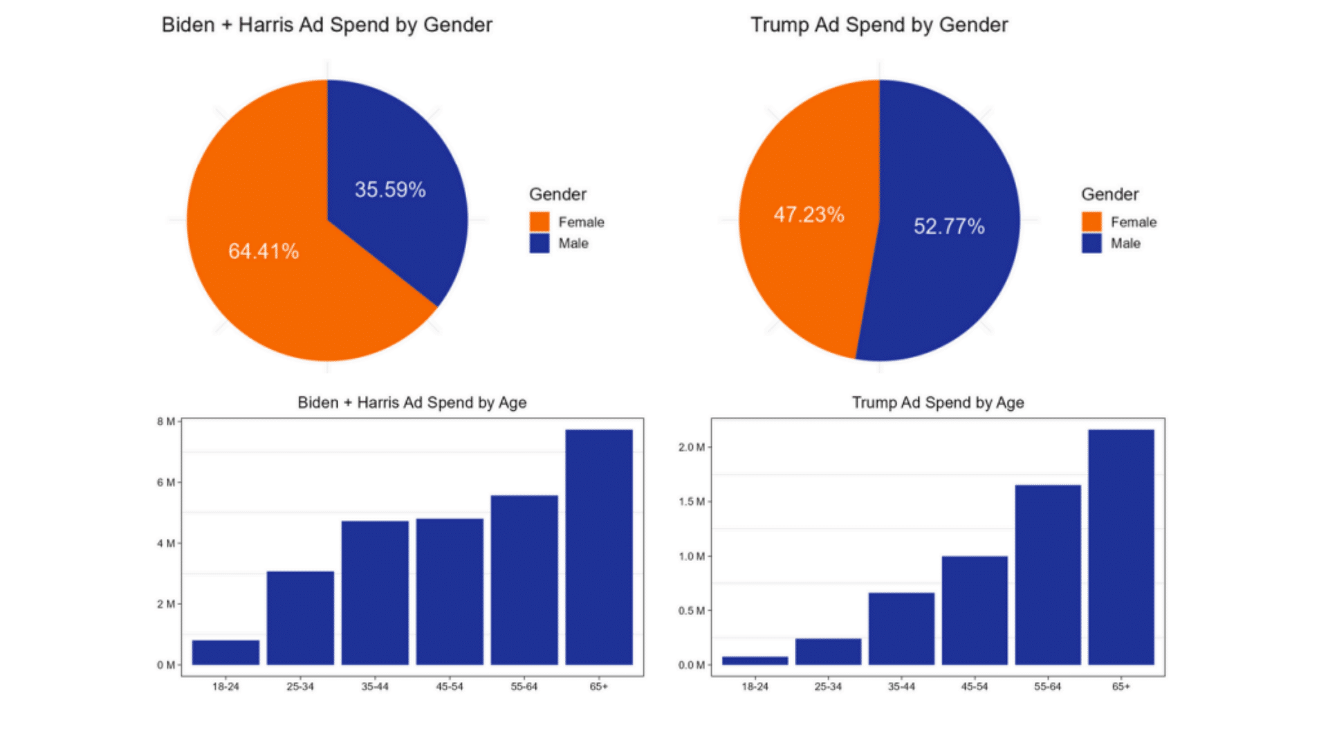 Par exemple, les publicités de Trump ciblent principalement les hommes plus âgés, tandis que la campagne de la candidate Harris s’adresse davantage aux femmes et aux jeunes adultes.