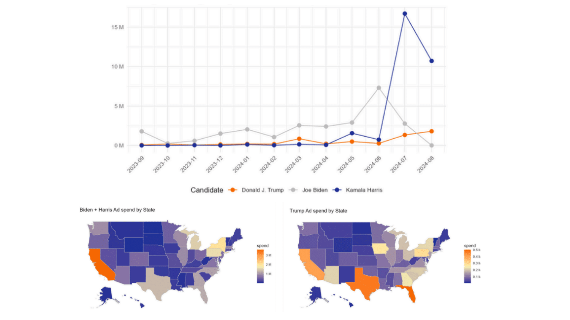 Ces données permettent d’établir un cadre visuel pour comprendre le flux d’informations – et de désinformations – qui cible les électeurs. L’analyse s’étend sur une année, couvrant les dépenses publicitaires de septembre 2023 à août 2024. Les publicités sont classées selon plusieurs critères, tels que la mention d’un candidat et le ton utilisé (positif, attaque, incivilité).