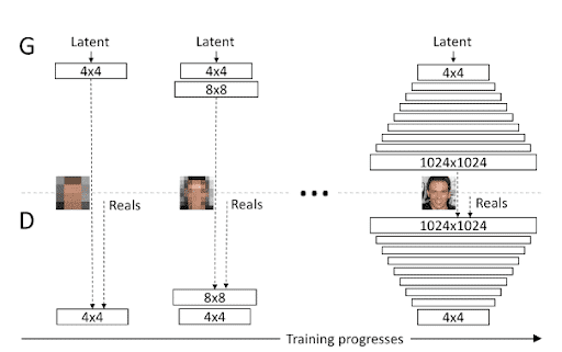 Le reste du réseau suit l’architecture des Progressive Growing GAN qui permet de travailler avec des résolutions d’images de plus en plus grandes.