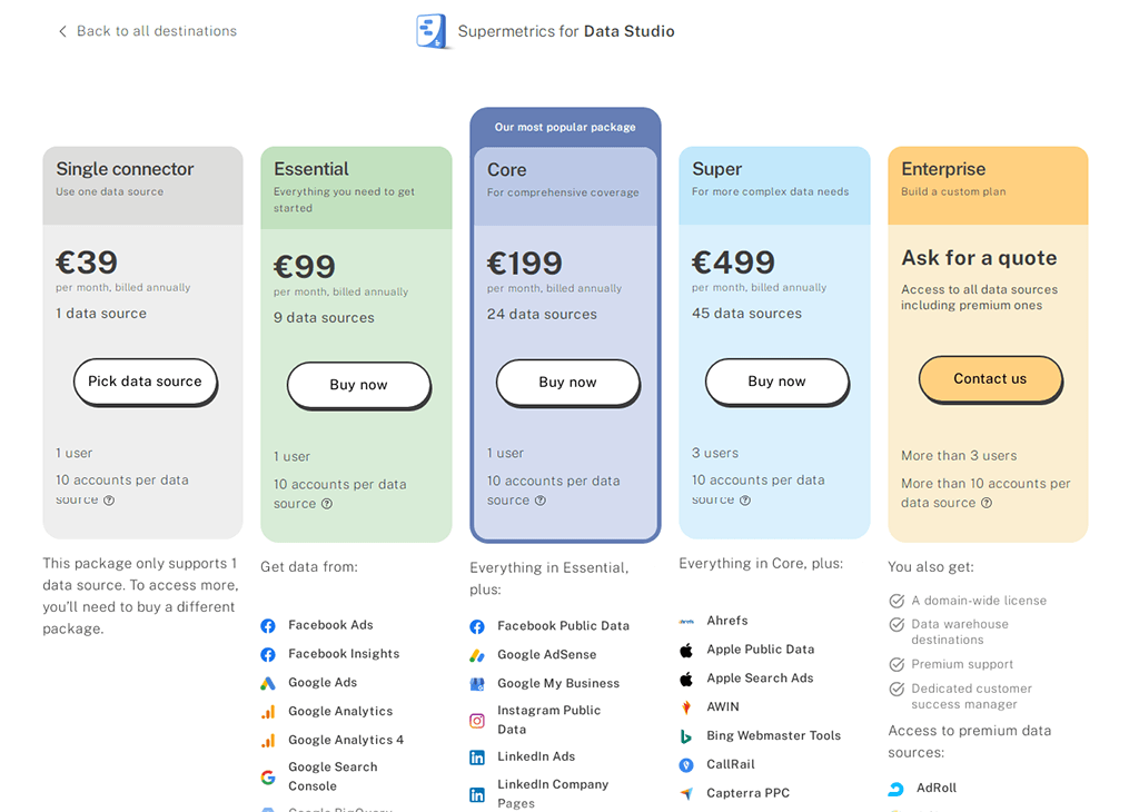 Supermetrics fonctionne par abonnement, son prix varie selon les besoins de ses utilisateurs et des outils de destinations qu’ils veulent utiliser. Ses prix commencent à 19€ par mois et peuvent monter jusqu’à 500€ . À savoir que les sources de données se débloquent à mesure que le prix d’abonnement augmente.