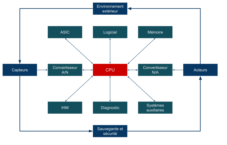- Des acteurs (ou actionneurs, ou encore actuateurs, qui interagissent avec l’environnement physique (moteurs, relais, vérins, etc.).