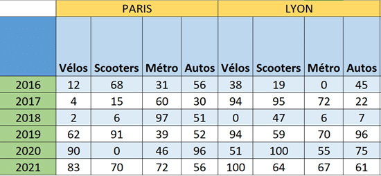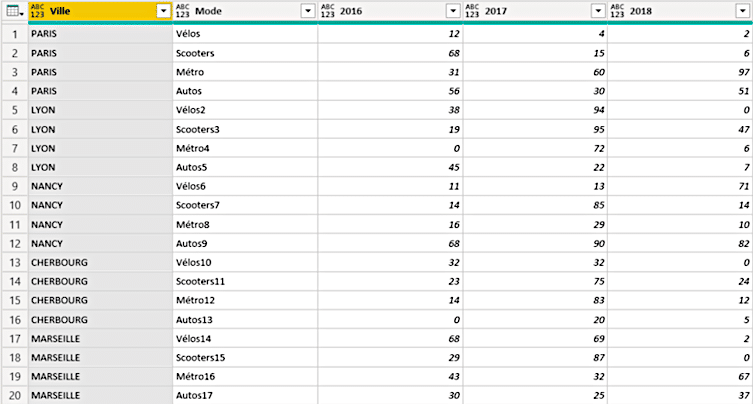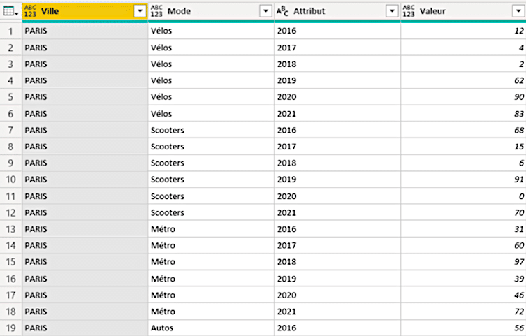 Dans l’exemple ci-dessous, nous retrouvons un tableau qui stocke des données sur les modes de transports dans de grandes villes françaises au cours du temps.