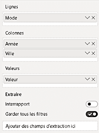 Dans Power BI, le visuel matrice permet de représenter des données en fonction de catégories communes, en lignes et en colonne. Dans notre exemple, les années sont résumées en en-têtes de catégorie de colonnes, déclinées ensuite entre les différentes villes. En ligne, nous retrouvons les différents modes de transport.