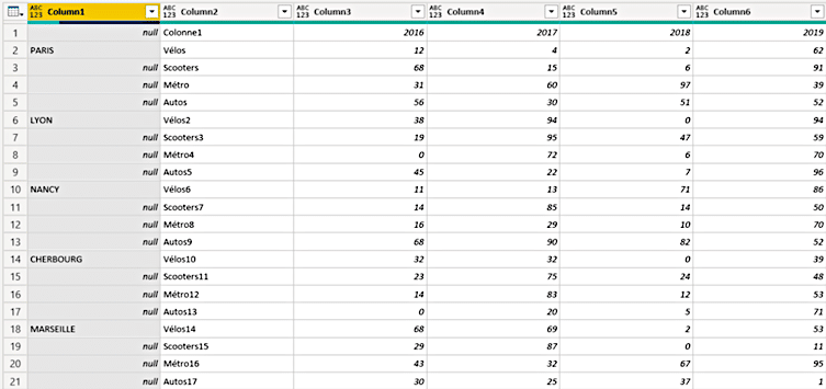 Mais Power BI n’est pas capable d’exploiter des données présentées comme cela. Pour rendre ce format de tableau exploitable, il est nécessaire d’effectuer plusieurs transformations avec Power Query.