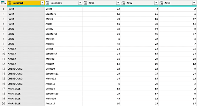 - nous supprimons ensuite une nouvelle fois le tableau croisé en sélectionnant les colonnes correctement mises en forme (Ville et Mode), et en utilisant l’outil « dépivoter les autres colonnes ».