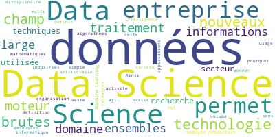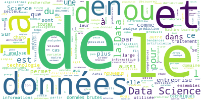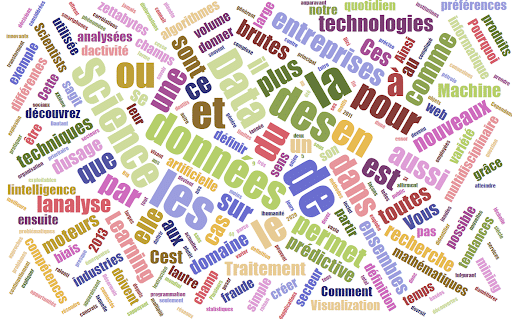 Il existe de nombreux sites et applications pour générer des wordclouds facilement et gratuitement. Par exemple, en voici un qui a été généré à partir d’un de nos articles d’introduction à la data science :